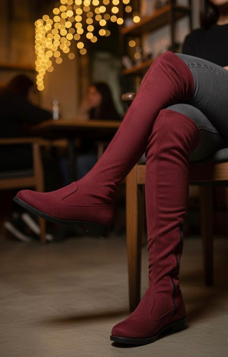 الليكرا Stretch فوق الركبة بيخلي البوت مناسب لأي وزن وأي ساق بدون تضييق أو عدم ارتياح — بيلبس ويمسك القَدَم والرجل بشكل مضبوط وأنيق.