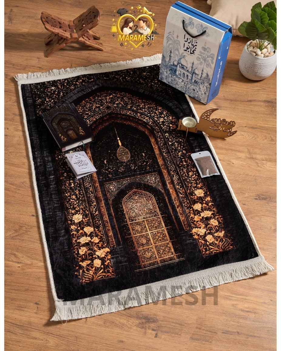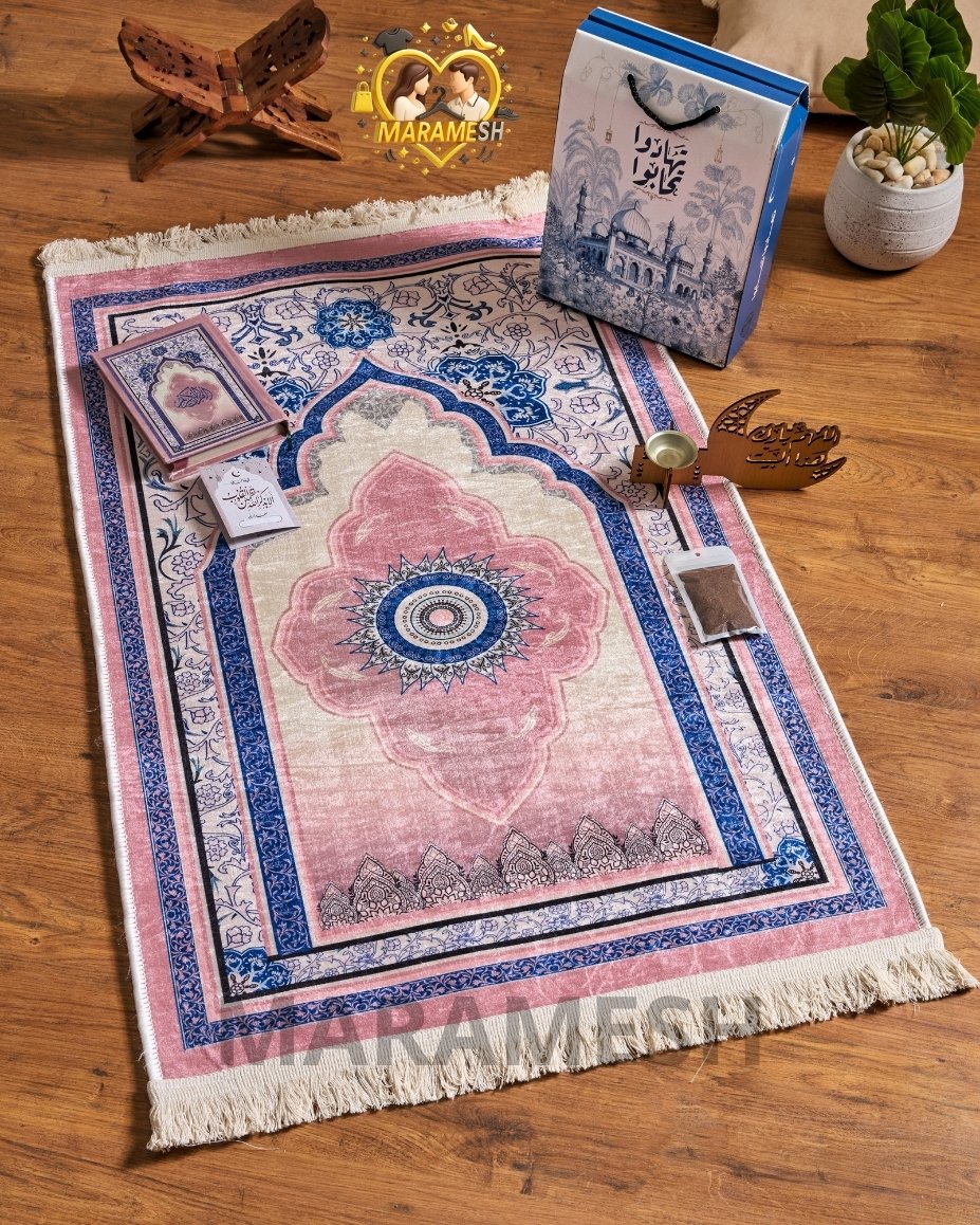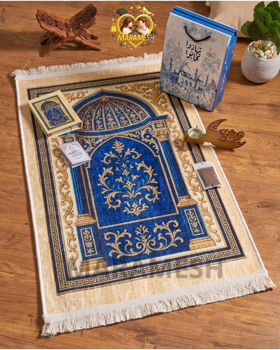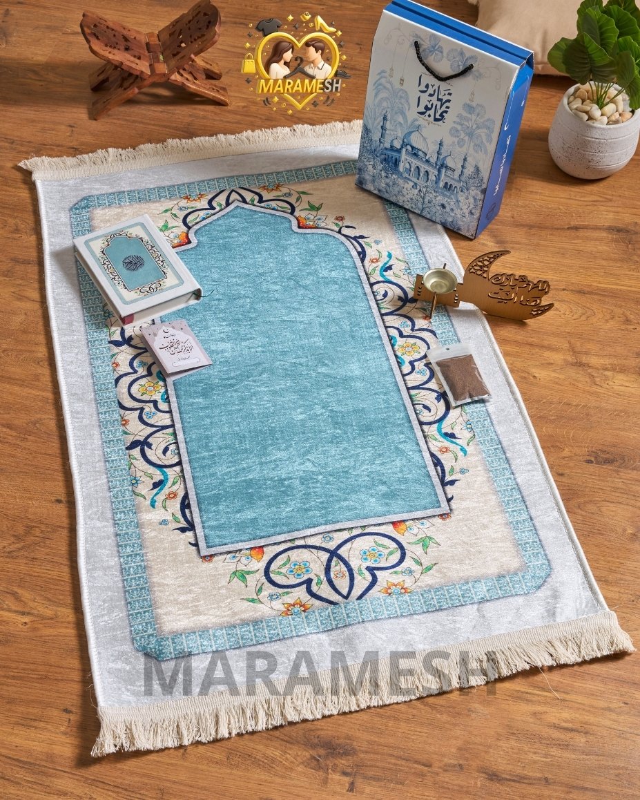 مكوّن من سجادة قطيفة تقيلة بخامة دوتس، مصحف قطيفة، مبخرة، بخور، وكارت أذكار داخل علبة قيمة جاهزة للتقديم فورًا.