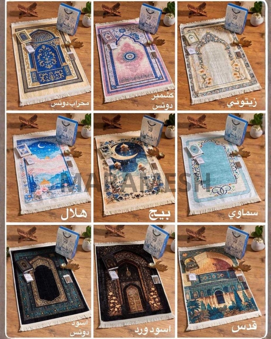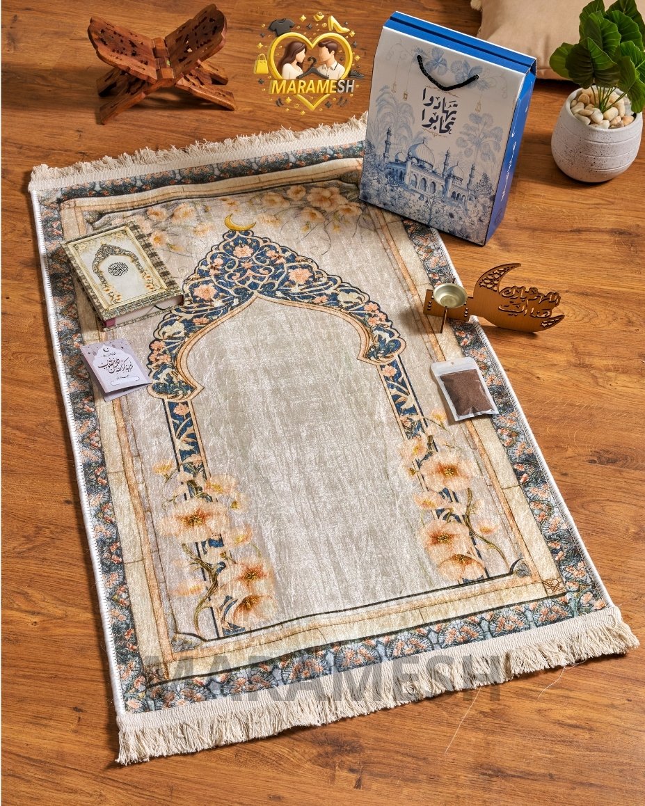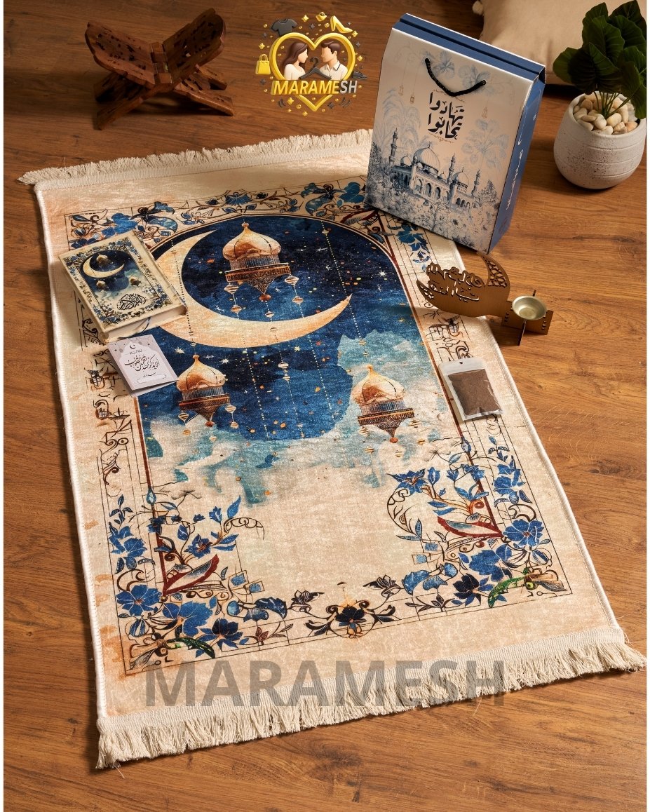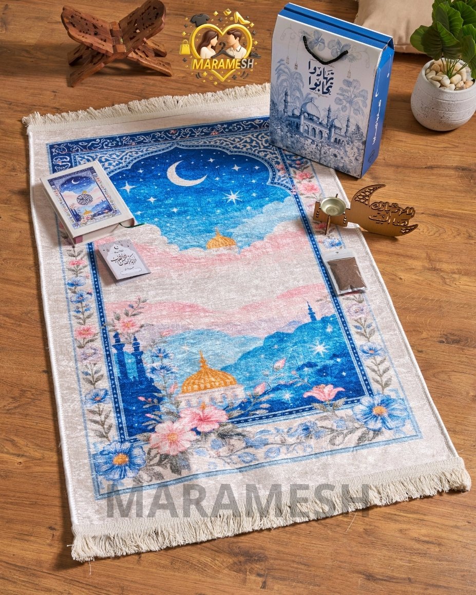 مكوّن من سجادة قطيفة تقيلة بخامة دوتس، مصحف قطيفة، مبخرة، بخور، وكارت أذكار داخل علبة قيمة جاهزة للتقديم فورًا.