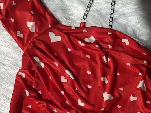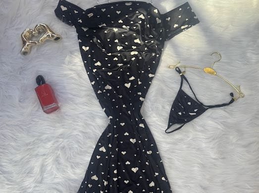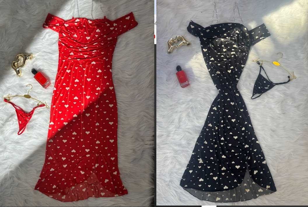 فستان حريمي  من Maramesh، خامة زبدة ناعمة مطبوع قلوب، تصميم أنيق مع حمالات استانلس، One Size يناسب من 60 حتى 85 كجم، متوفر باللونين الأحمر والأسود.
