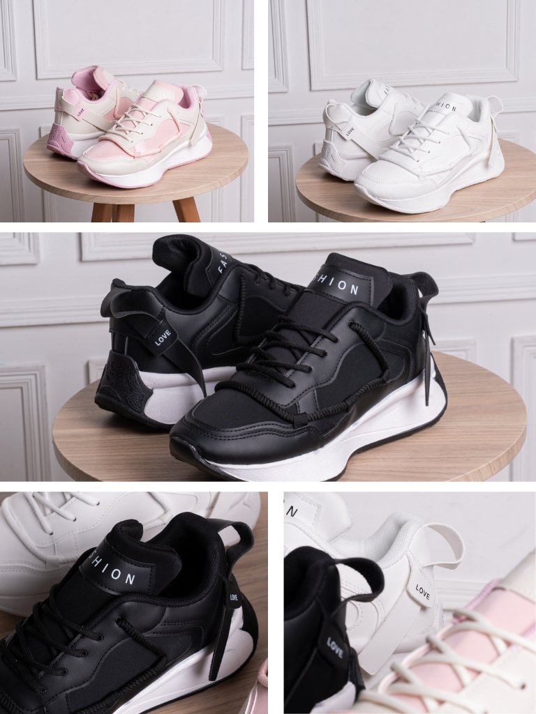 كوتشي مستورد Fashion R3 👟 خامة فوندي مستورد، تصميم تريندي مكتوب عليه FASHION وLOVE، نعل خفيف ومريح، ألوان أبيض، أسود، وبينك، مناسب لكل الخروجات اليومية.